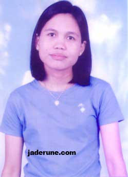 4. Narissa O. Larita, Born 9-21-1983, Height 5'3", Weight 120 lbs., Catholic, never married, no children. Work: Sales girl. She does not smoke, may have a drink on special occasions only. Likes: responsible man, humble, religious, honest, approachable, nice one and God fearing man. Dislikes: rude, pretender, boastful, idiot/stupid, arrogant and dishonest. Hobbies: reading pocketbooks, writing, playing volleyball, table tennis, Tae Kwon Do, cooking, and I really love to travel anywhere in the world. Seeking a good man who is about 25-60 years old who is responsible, broadminded, caring, honest, faithful, approachable, humble, has a good sense of humor, is God fearing and can spend his love @ life with me, as simple as me. Hope someone wants to reply my letter who has a pure heart, is sincere, a good man who has a humble personality. Comments: To Jaderune, thank you for helping us to find a good partner in life in the way of publishing. More and more power to all the staff and God bless us all. Cebu City |